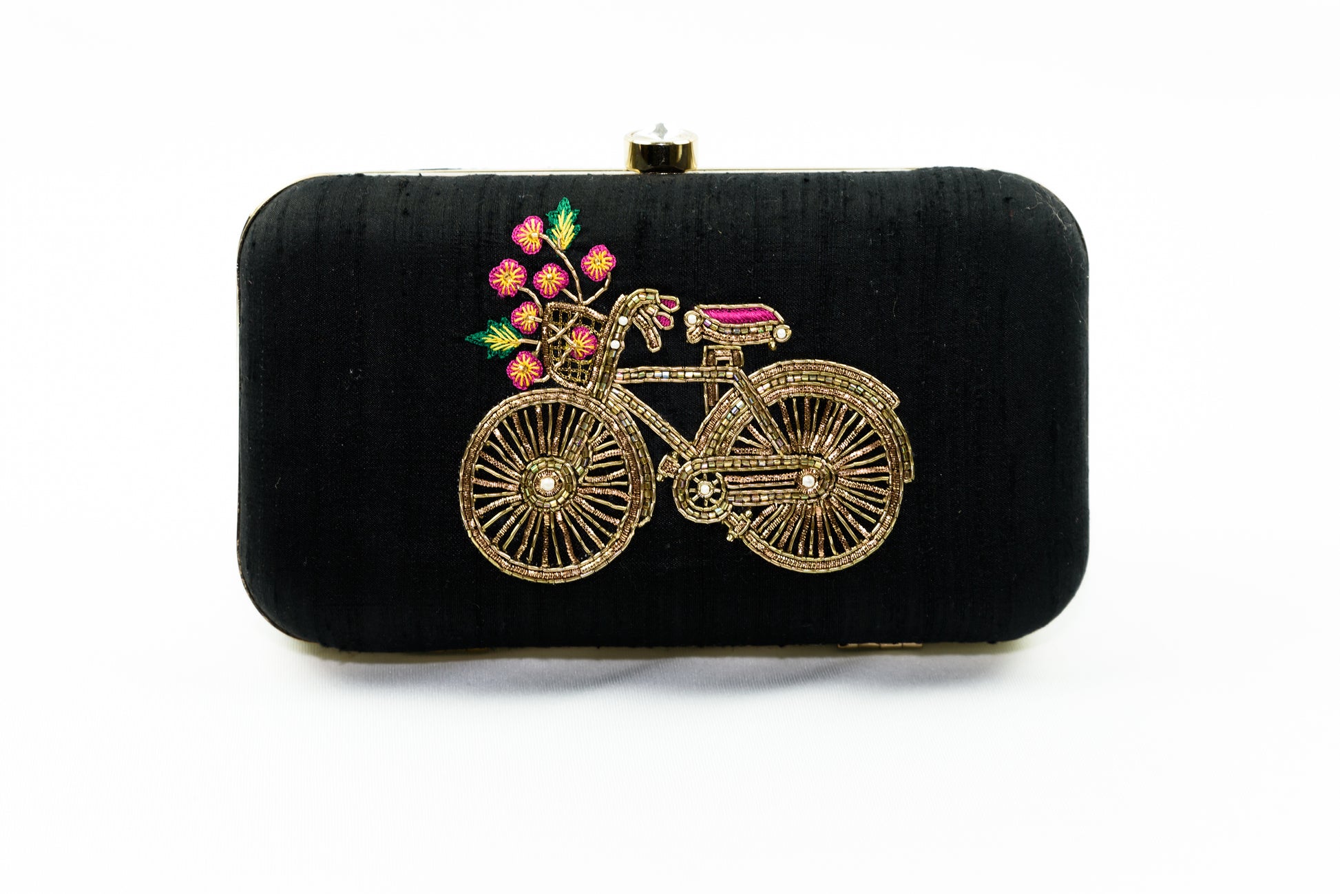 Raw silk clutches hand embroidered on one side with a cycle, comes along with a sling and a diamond buckle. Customisation in colour available.