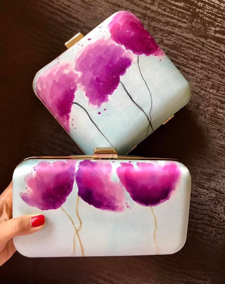 Pure satin clutch silk painted with powder puff plants comes along with a sling and a rectangle buckle. Customisation available