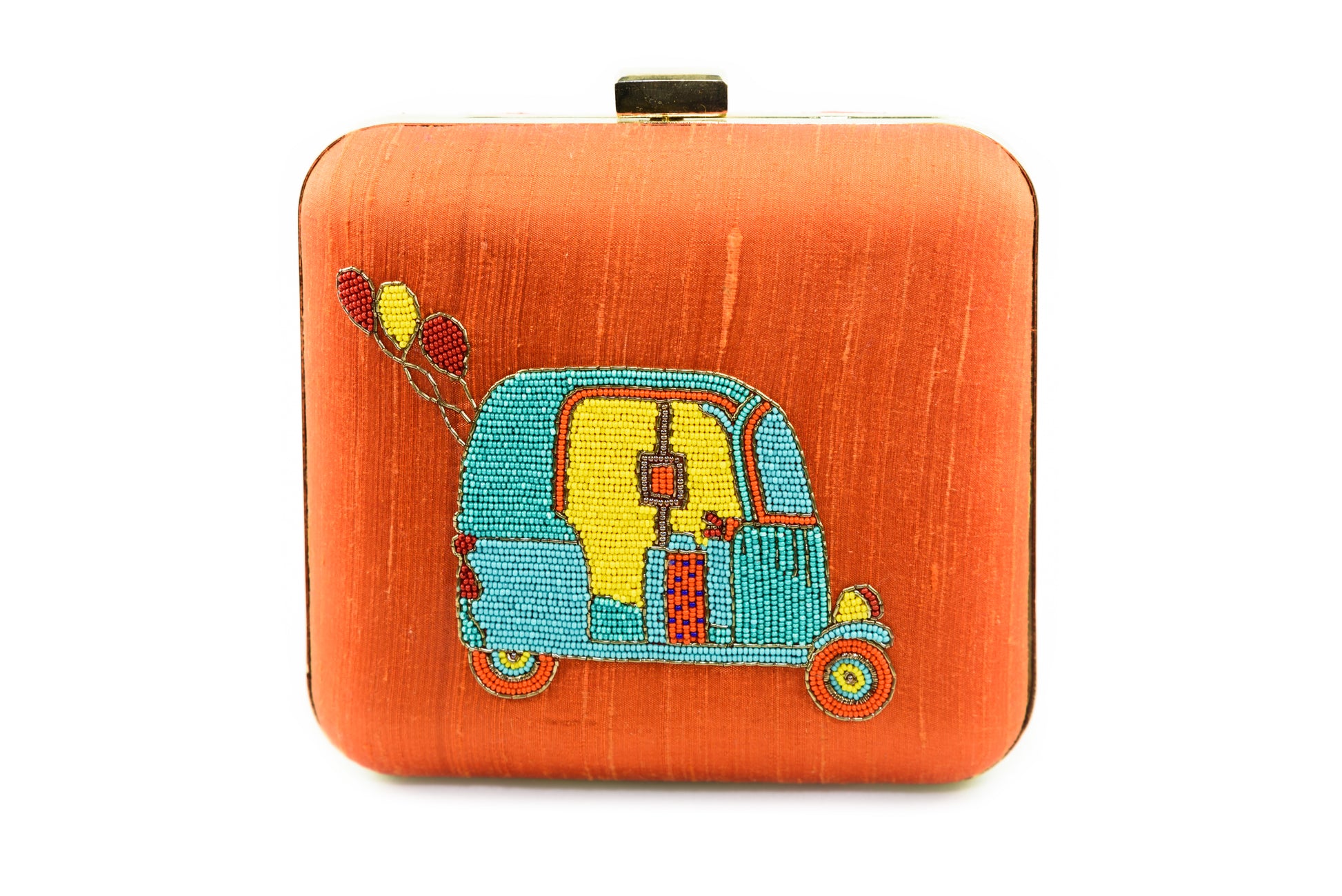 Raw silk clutches hand embroidered on one side with a cute auto rikshaw with balloons, comes along with a sling and a diamond buckle. Customisation in colour available